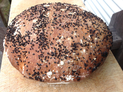 Ho spolverato il sesamo nero in superficie e fatto cuocere in forno preriscaldato a 220°C per circa un'ora (questi dati si adattano al forno usato da me), forse la cottura è stata leggermente più lunga del dovuto, ma il colore del pane è fantastico ed il profumo altrettanto